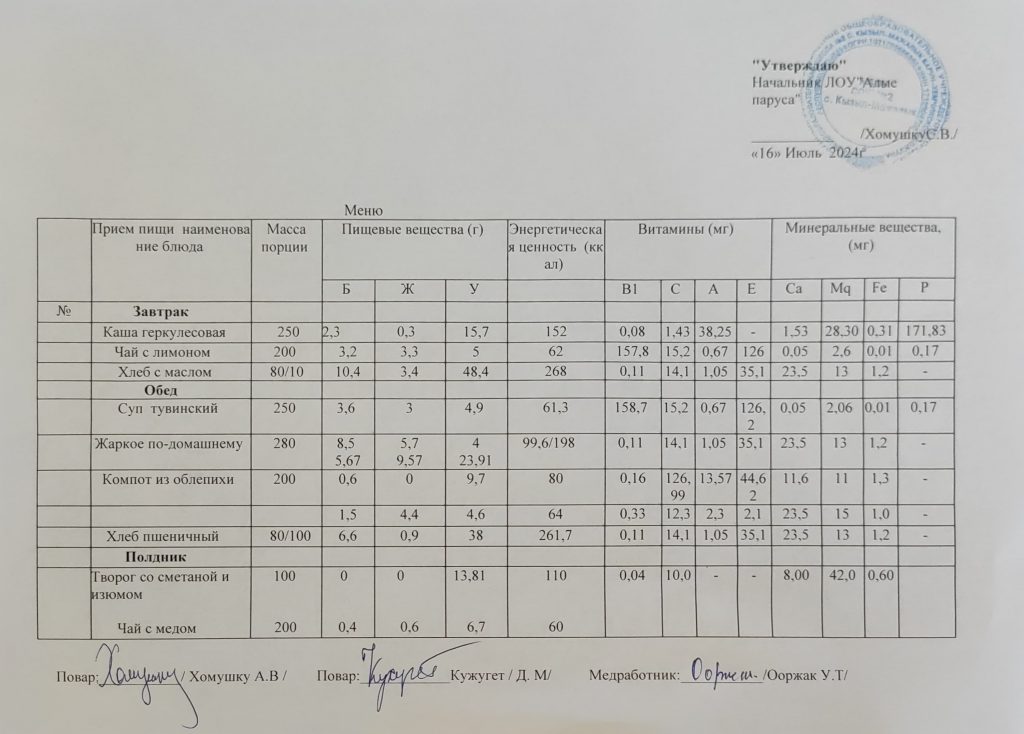 ЛОК-2024, Пришкольный лагерь "Алые паруса"-24 Меню на 16 июля 16.07.2024 / Related posts: Санитарно-эпидемиологическое заключение «Алые паруса» Меню на 8 июля Меню на 9 июля День шестнадцатый. 16 июля