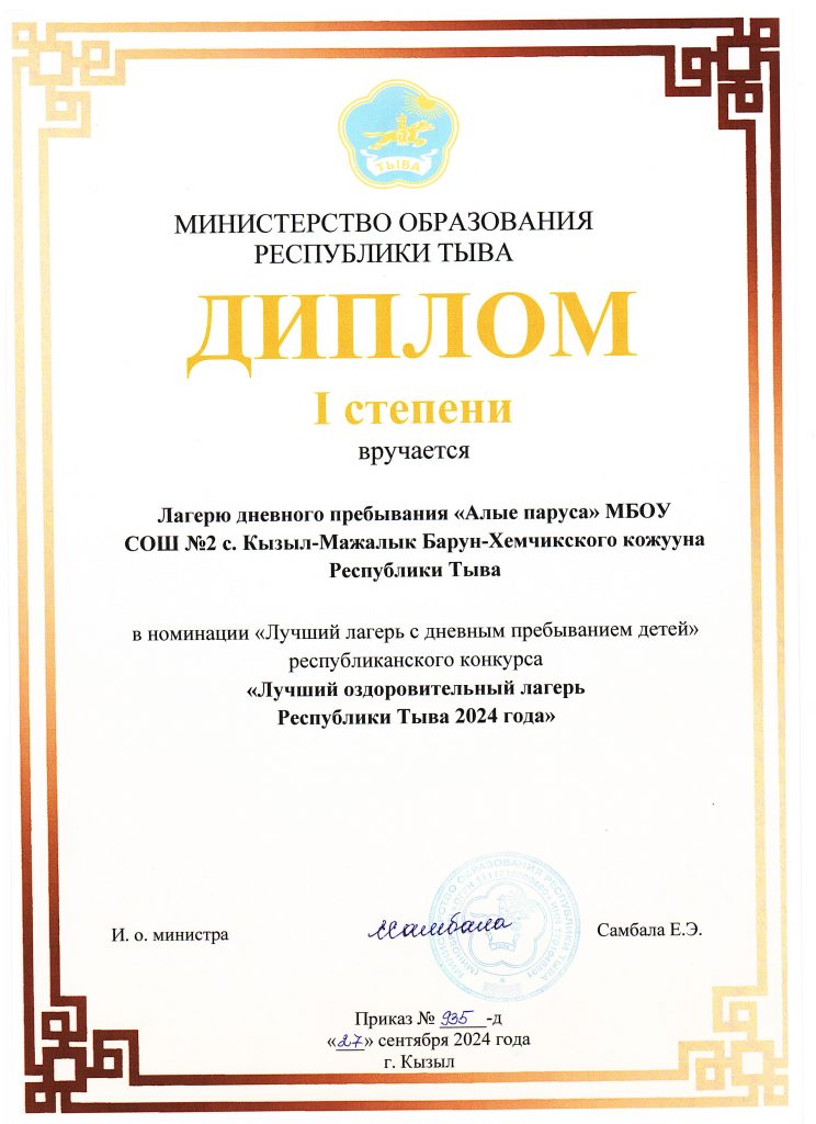 ЛОК-2024, Пришкольный лагерь "Алые паруса"-24 Диплом 1-й степени Министерства образования РТ «Лучший оздоровительный лагерь Республики Тыва 2024 года» 01.10.2024 / Related posts: Постановление администрации Барун-Хемчикского кожууна «Об установлении оплаты стоимости путевки в оздоровительные лагеря с дневным пребыванием детей и загородный стационарный оздоровительный лагерь Шолбан-Ак, летней оздоровительной кампании в Барун-Хемчикском кожууне на 2024 год» Меню на 5 июля День десятый. 10-е июля Меню на 12 июля