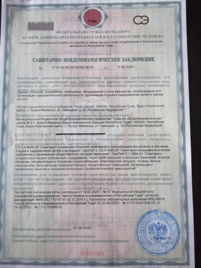 Летние каникулы-25, ЛОК-25, федеральные НПА ЛОК-25 Санитарно-эпидемиологическое заключение 20.06.2025 / Related posts: Приказ Минобр РТ от 29 января 2025 №112-д «О подготовке к проведению летней оздоровительной кампании 2025 года» Приказ МИНОБР РТ от 30.12.2024 №1267-д «Об утверждении категорий риска в организациях отдыха детей и их оздоровления на территории Республики Тыва в 2025 году» Постановление Правительства Республики Тыва от 05.02.2025 №34 «Об утверждении Порядка обеспечения выполнения квоты в государственных и муниципальных организациях отдыха детей и их оздоровления, расположенных на территории Республики Тыва, для детей-инвалидов и детей с ограниченными возможностями здоровья» Приказ Минобр РТ от 21.01.2025 №70-д «Об утверждении плана мероприятий («дорожной карты») по реализации государственной программы Российской Федерации модернизация объектов инфраструктуры, предназначенных для отдыха детей и их оздоровления, обеспечивающих достижение целей, показателей и результатов федерального проекта «Создание условий для обучения, отдыха и оздоровления детей и молодежи» государственной программы Российской Федерации «Развитие образования» на 2022-2025 годы на Капитальный ремонт зданий «Стационарного лагеря «Таежный» гАк-Довурак (местечко Шолбанак)»»