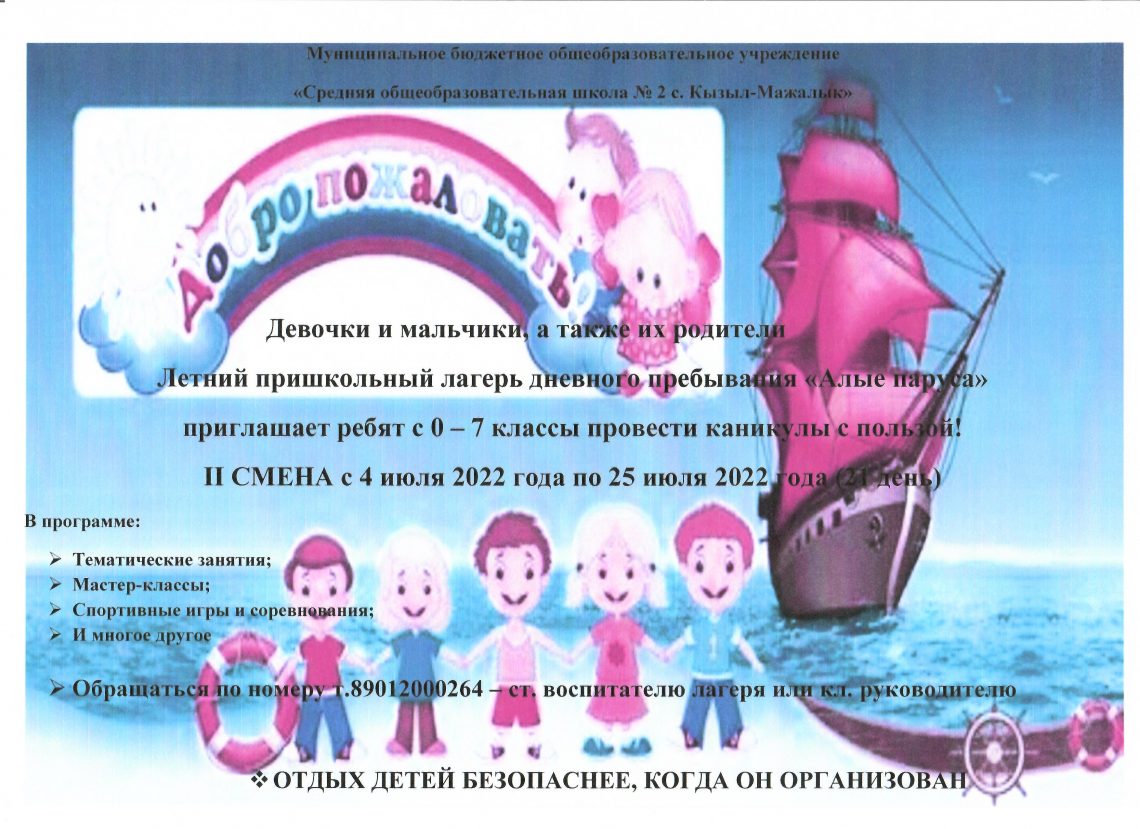 Безопасное лето, Новости, Пришкольный лагерь "Алые паруса", Ура! Каникулы! Летний пришкольный лагерь приглашает!!! 27.04.2022 / Related posts: Летний пришкольный лагерь «Алые паруса» ждёт Вас!!! Приказ УО «О подготовке к проведению летней оздоровительной компании в Барун-Хемчикском кожууне Семь шагов к лету Приказ Министерства образования «О временных досуговых центрах для неорганизованных детей в период летней оздоровительной компании в Республике Тыва»