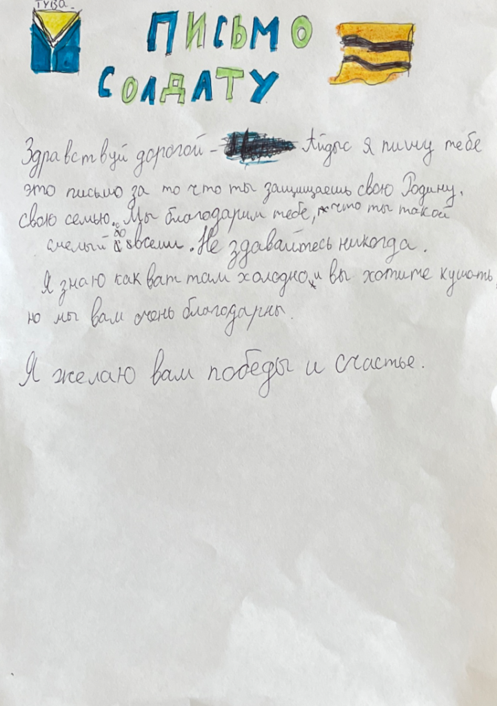 В отрядах прошли минутки по защите животных. Дети рассказали как они ухаживают за своими любимыми животными, как помогают зимой преодолеть морозы. Дальше по плану в лагере посещение выставки, посвященному 80-летию Ш.Д. Ооржаку, первому президенту нашей республики, дальше экскурсия в модельную библиотеку. После обеда в отрядах дети писали письма, присоединились к акции «письмо солдату». В каждом письме дети вложили частичку тепла, сопереживание и поддержку нашим солдатом. Передавали огромные приветы и скорейшего возвращения домой. Письма были отправлены по адресу.