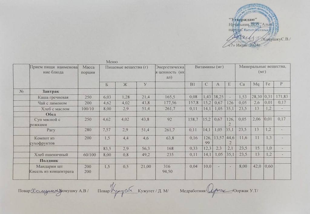 ЛОК-2024, Пришкольный лагерь "Алые паруса"-24 Меню на 7-е июля 07.07.2024 / Related posts: Постановление Правительства Республики Тыва от 05.03.2024 № 88 «О внесении изменения в пункт 2 Нормативов оплаты стоимости путевки в санатории, санаторные оздоровительные лагеря круглогодичного действия, загородные стационарные детские оздоровительные лагеря, оздоровительные лагеря с дневным пребыванием детей» Меню на 4 июля Меню на 5 июля Меню на 6 июля