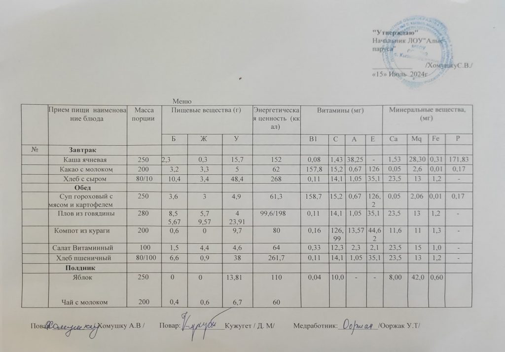 ЛОК-2024, Пришкольный лагерь "Алые паруса"-24 Меню на 15 июля 15.07.2024 / Related posts: Постановление администрации Барун-Хемчикского кожууна «Об установлении оплаты стоимости путевки в оздоровительные лагеря с дневным пребыванием детей и загородный стационарный оздоровительный лагерь Шолбан-Ак, летней оздоровительной кампании в Барун-Хемчикском кожууне на 2024 год» Меню на 4 июля День девятый. 9-е июля День двенадцатый. 12 июля